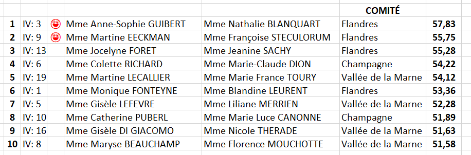Dans cette finale de ligue où 28 paires se sont présentées, très nette domination des paires du comité qui prennent les 3 premières places. Très rapidement en tête, mesdames Anne-Sophie GUIBERT et Nathalie BLANQUART n'ont pas faibli, s'imposant avec une avance confortable. La seconde place qualificative pour la finale nationale, a été longtemps indécise et finalement mesdames Martine EECKMAN et Françoise STECULORUM la prennent d'extrême justesse devant mesdames Jeanine SACHY et Jocelyne FORET (55.78% contre 55.28%), faible écart rageant pour les éliminées , mais bravo à toutes!